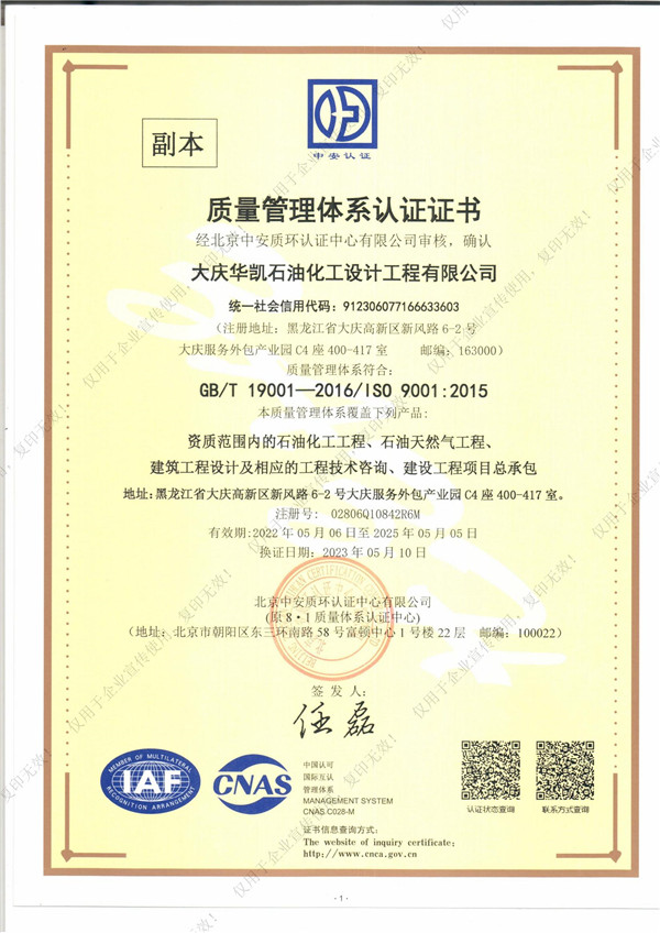近日,我司順利通過質(zhì)量管理體系認(rèn)證,這標(biāo)志著華凱公司在項目質(zhì)量體系建設(shè)上已經(jīng)達(dá)到了相關(guān)標(biāo)準(zhǔn)。質(zhì)量管理體系認(rèn)證證書的取得同時也是公司各項管理工作的規(guī)范化、標(biāo)準(zhǔn)化的體現(xiàn),是對公司持續(xù)穩(wěn)定健康發(fā)展的重要保證。我們將進(jìn)一步優(yōu)化和規(guī)范各項管理制度,不斷提高體系運(yùn)行的有效性,不斷提高公司的管理水平,共同推進(jìn)公司的快速發(fā)展。自此,華凱公司質(zhì)量管理體系的標(biāo)準(zhǔn)化、規(guī)范化及科學(xué)化又邁上新臺階。